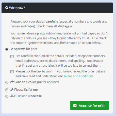 When the file passes preflight, there are 4 options available to customers: